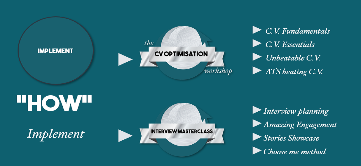 In the "HOW" part of the course I support your Implementation for Job Hunting. I will guide you through 4 units in the CV optimisation workshop, and a further 4 units in the Interview Masterclass.